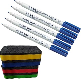 Staedtler Lumocolor Whiteboard-Marker, Rundspitze ca. 1 mm Linienbreite, 5er Pack Blau, trocken und rückstandsfrei abwischbar von Whiteboards inkl. Whiteboardlöscher (Farbe Nicht wählbar)